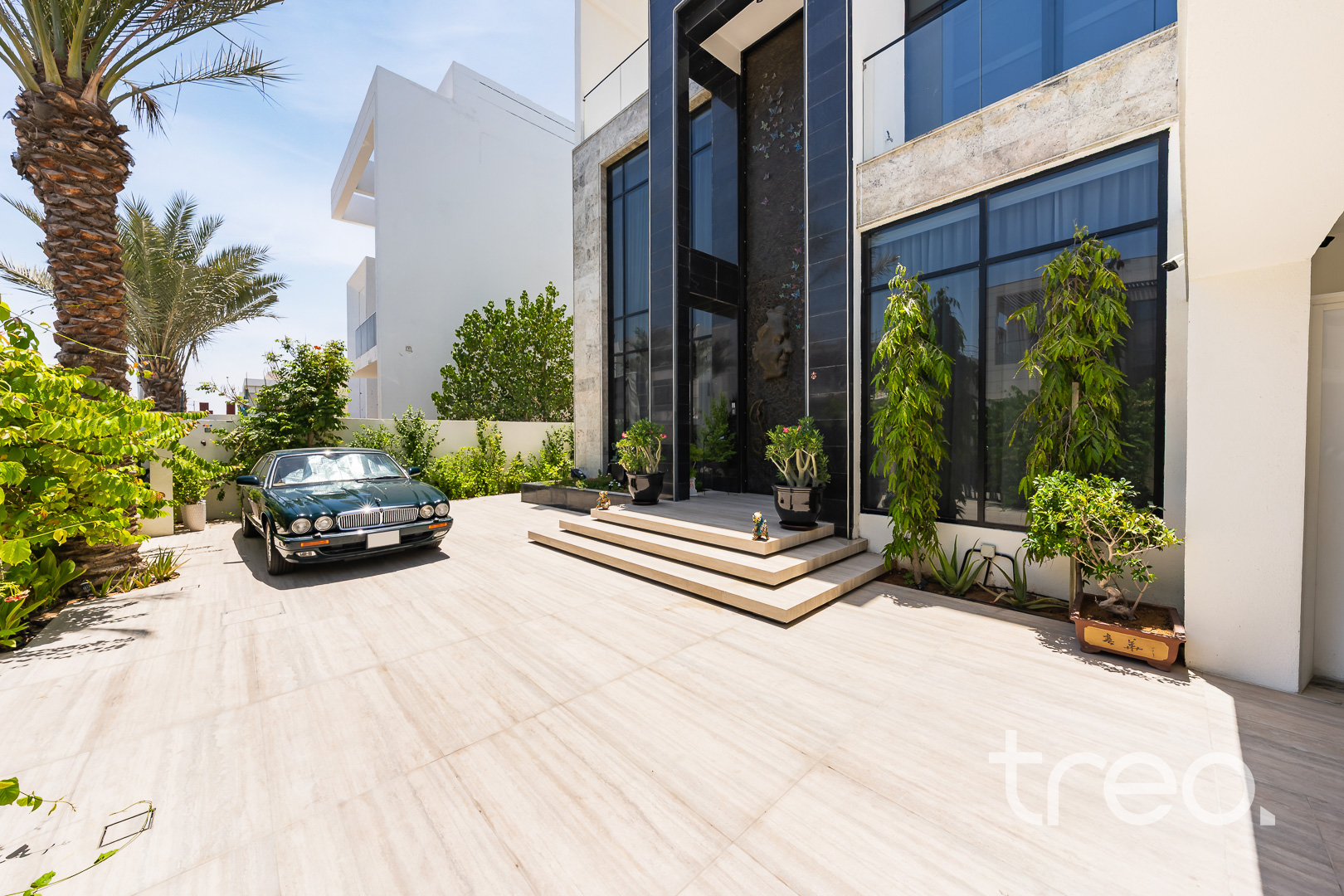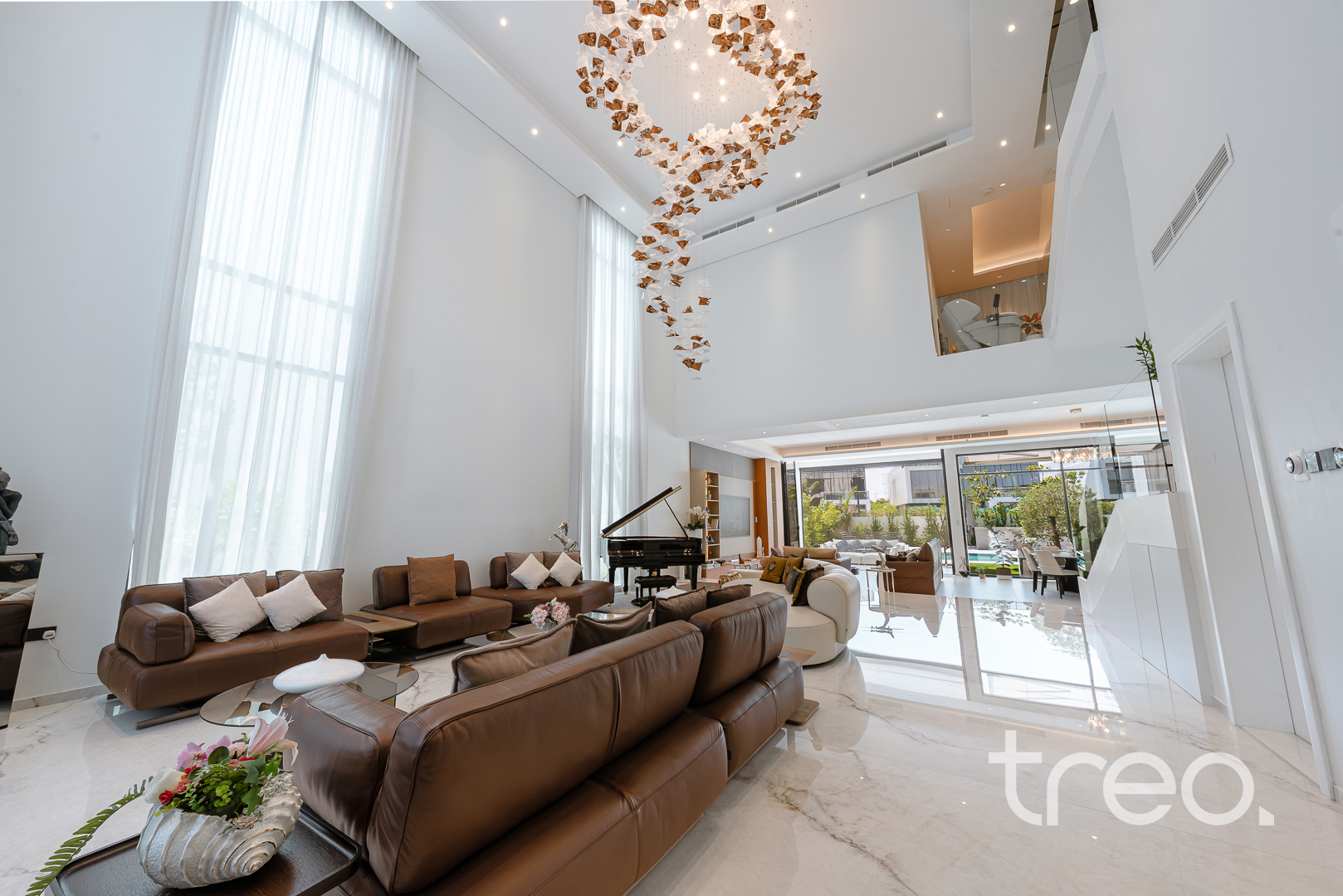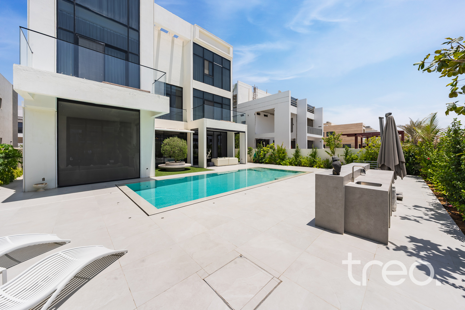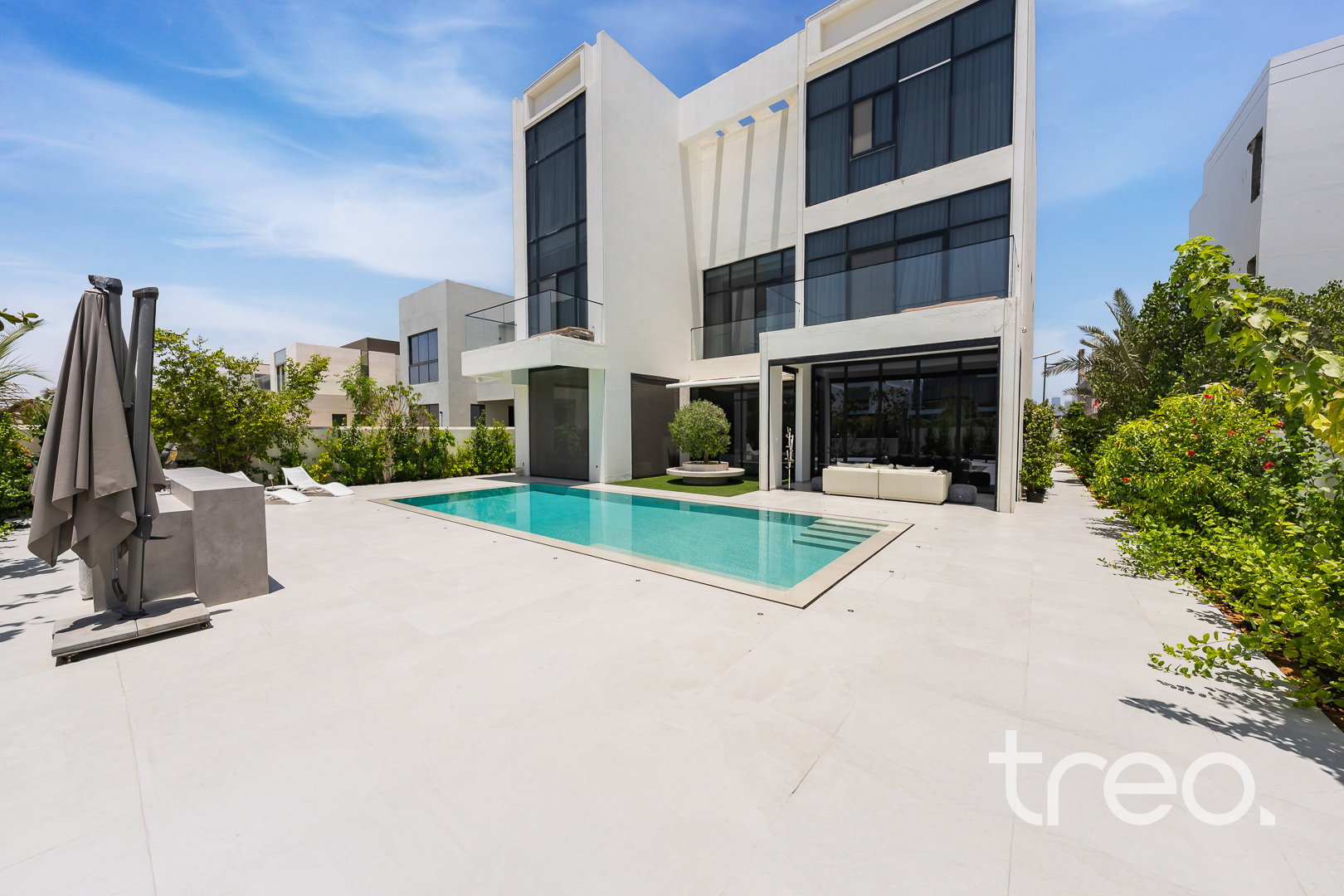 As you enter this villa, you immediately see the double height ceilings leading into the living, dining area and Italian fully fitted kitchen. Additional features include a double garage that accommodates two cars, a chef's kitchen, a maid's room, a driver's room and one downstairs en-suite bedroom. Upstairs, there are 5 en-suite bedrooms with built-in wardrobes and private balconies with access from a private elevator. Situated on a spacious 8,200 sq.ft plot approximately, which backs directly onto the brand new park offering various amenities, this villa comes with a private 11m infinity pool.