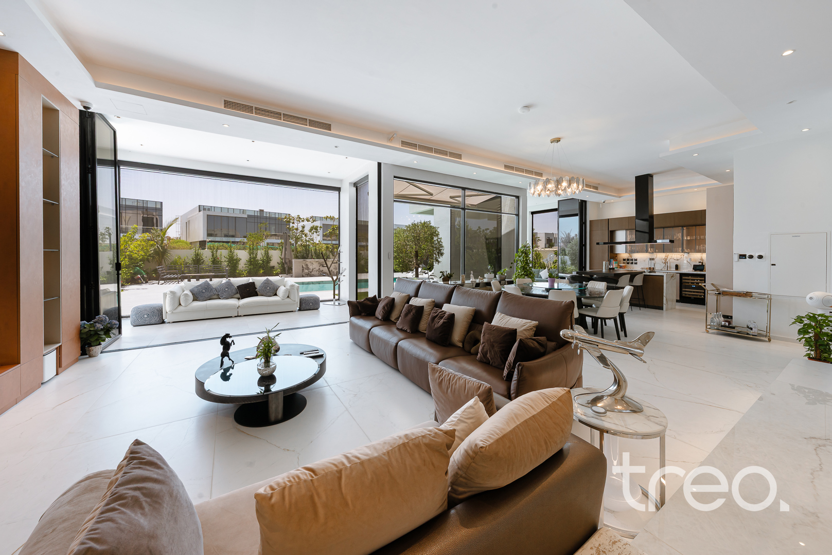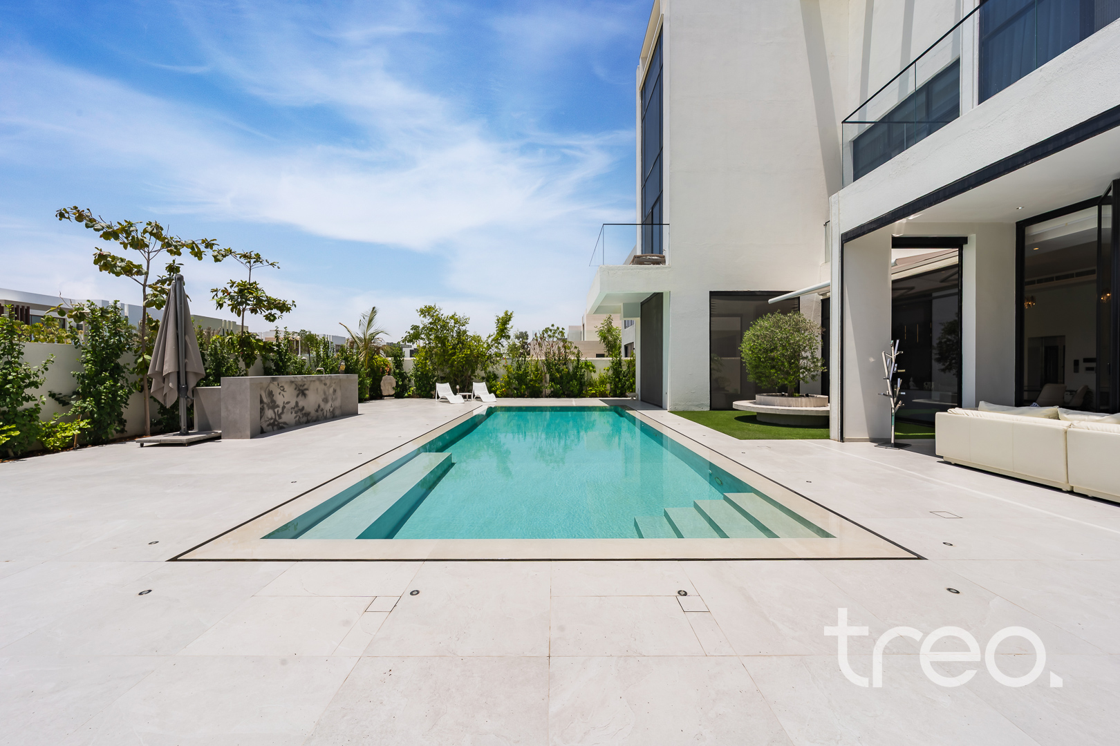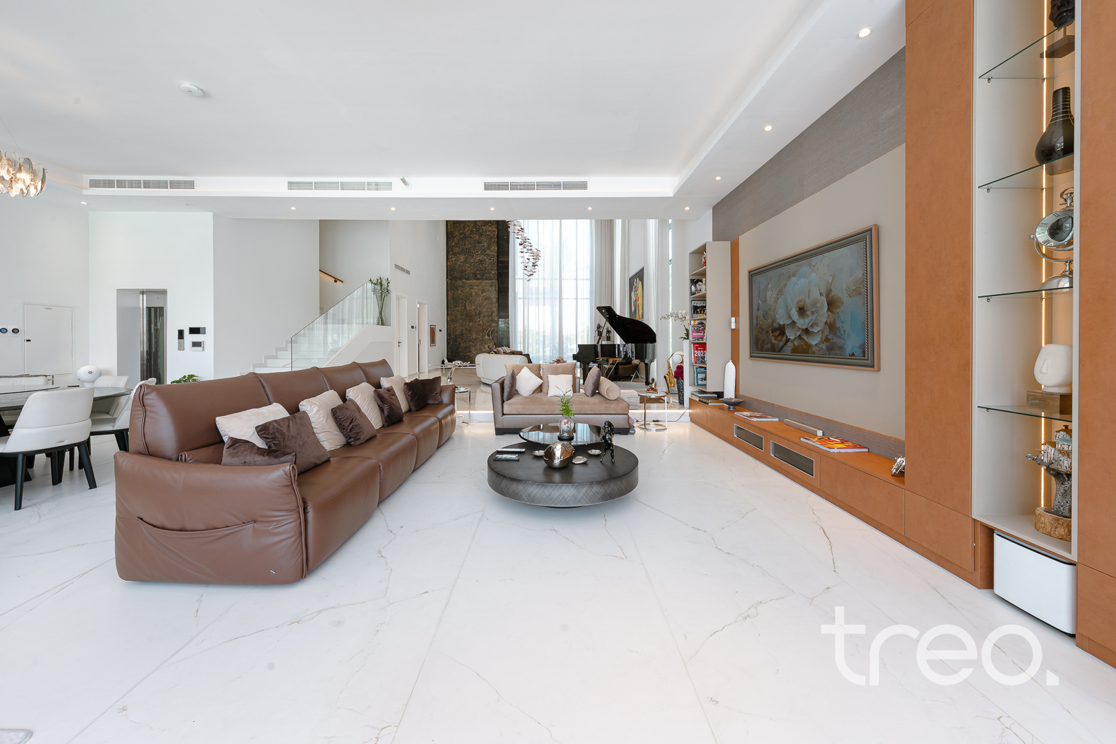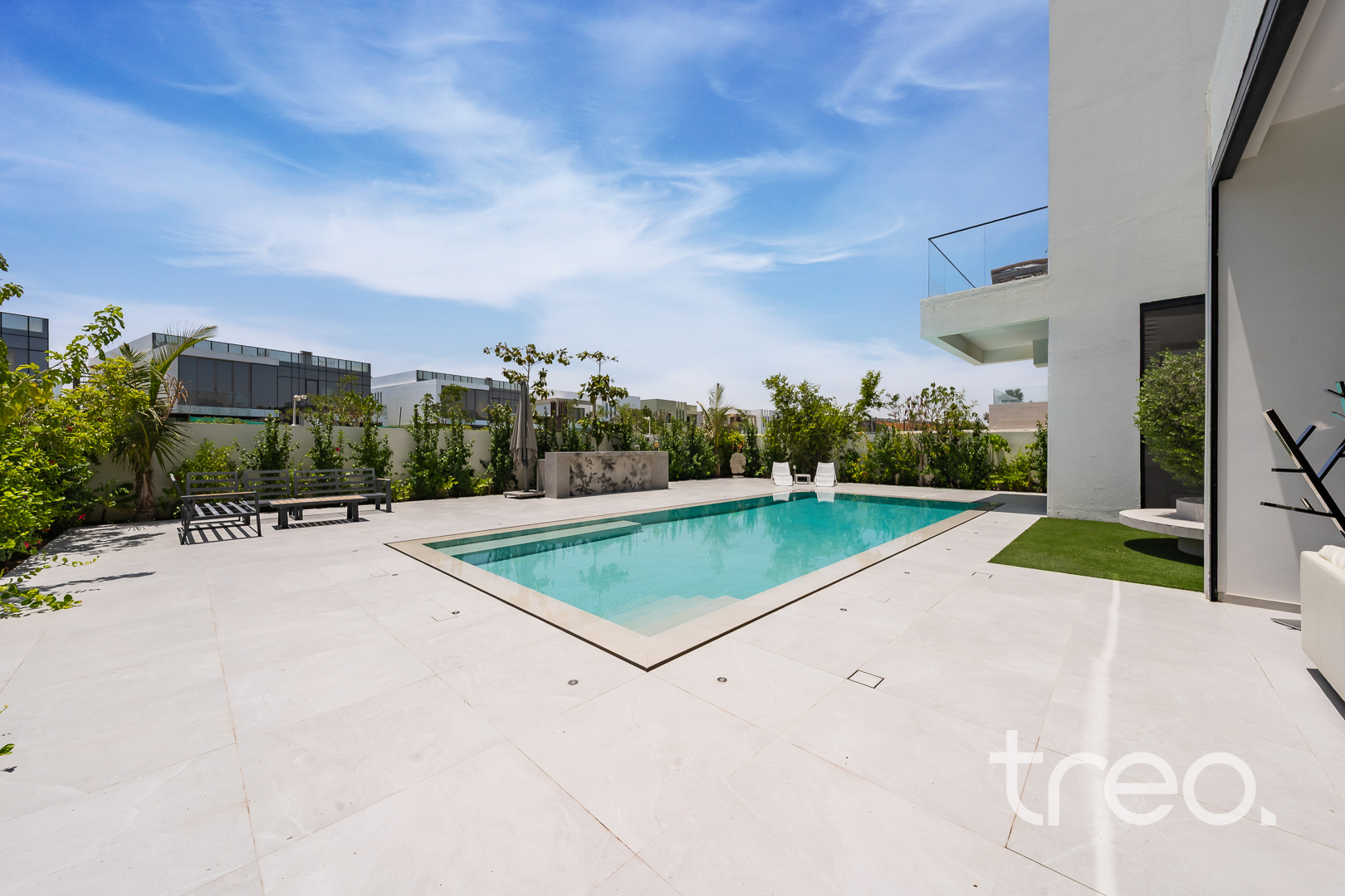 As you enter this villa, you immediately see the double height ceilings leading into the living, dining area and Italian fully fitted kitchen. Additional features include a double garage that accommodates two cars, a chef's kitchen, a maid's room, a driver's room and one downstairs en-suite bedroom. Upstairs, there are 5 en-suite bedrooms with built-in wardrobes and private balconies with access from a private elevator. Situated on a spacious 8,200 sq.ft plot approximately, which backs directly onto the brand new park offering various amenities, this villa comes with a private 11m infinity pool.
