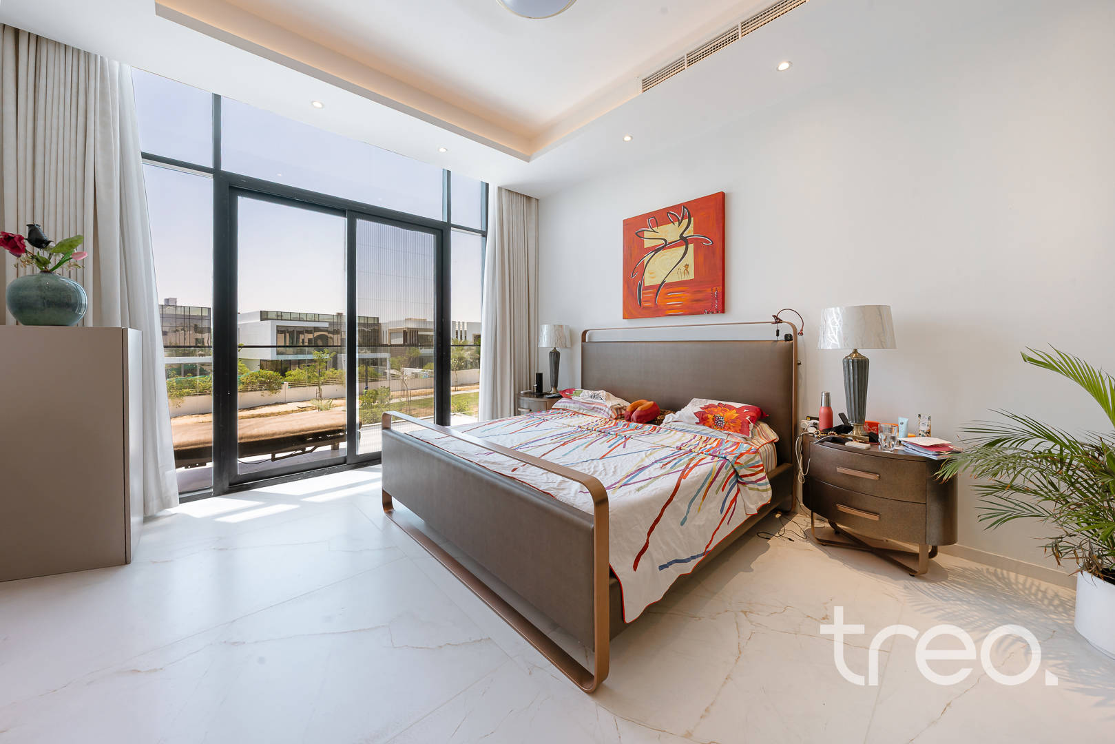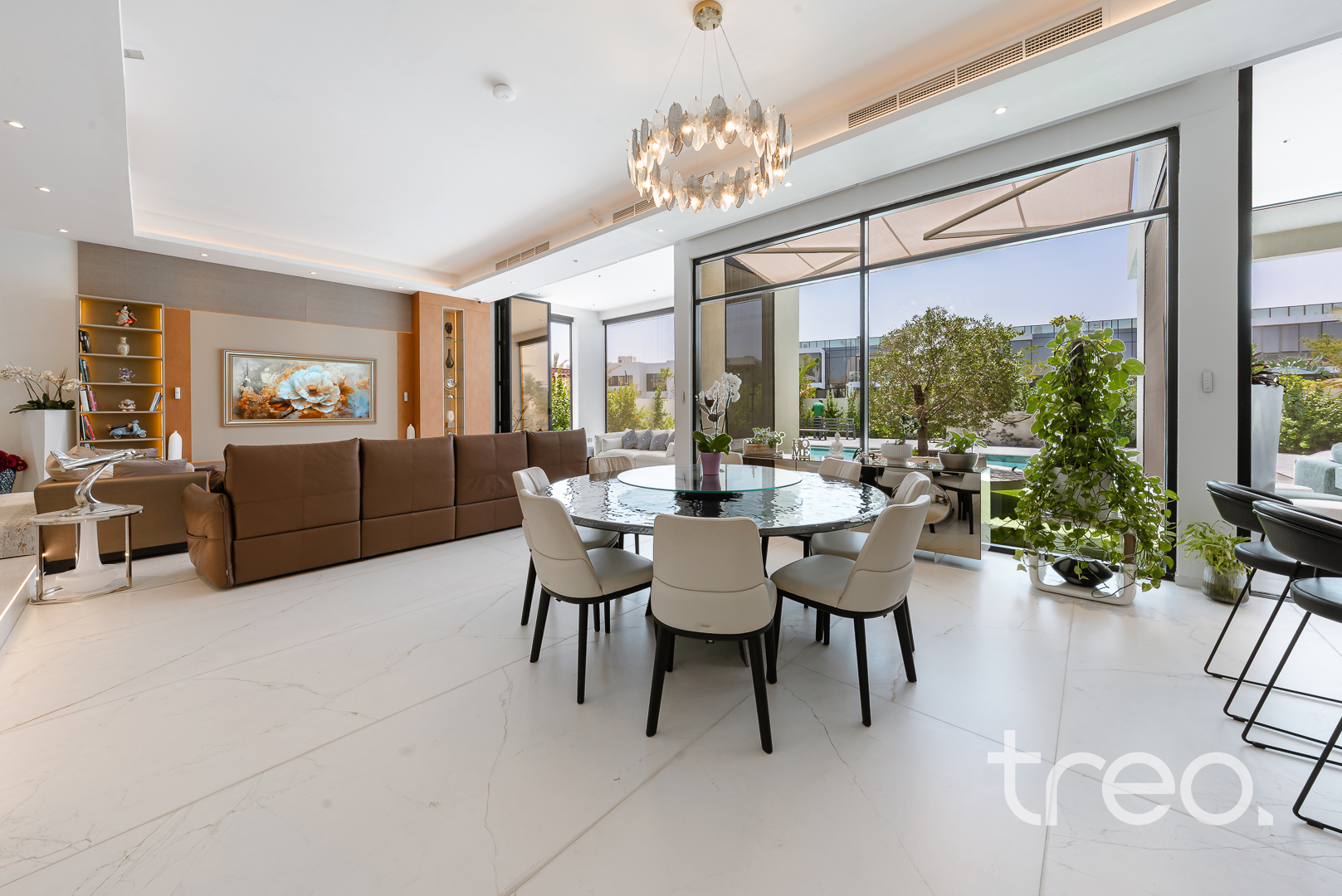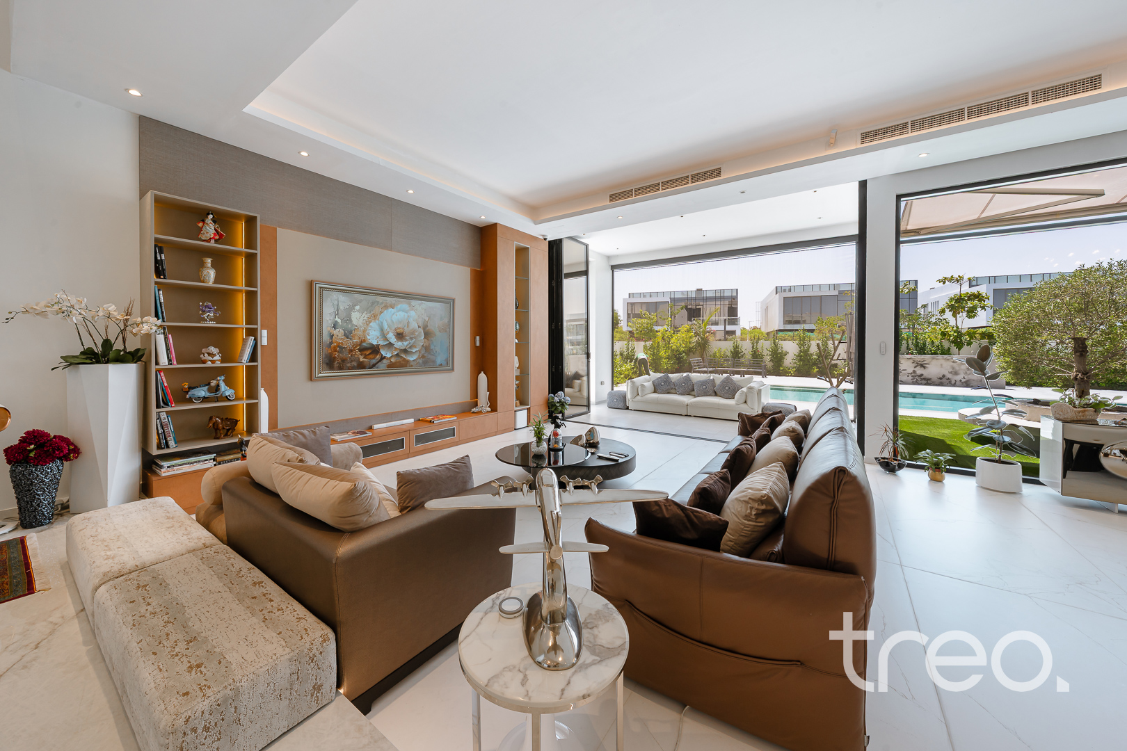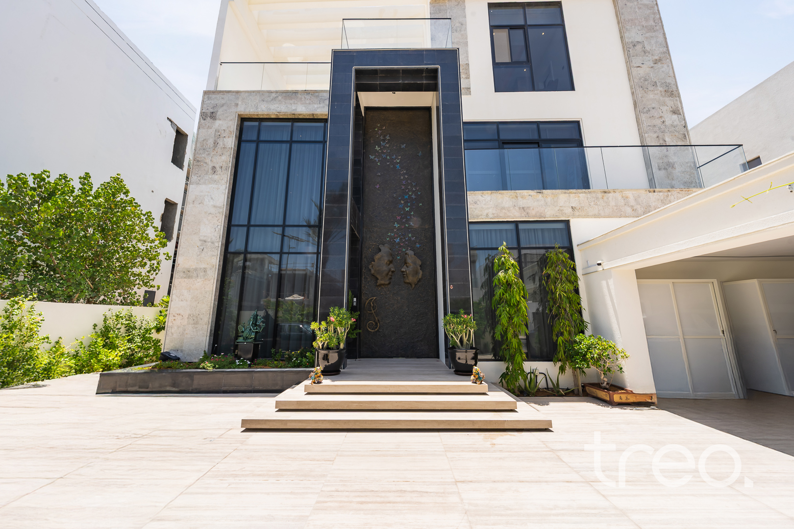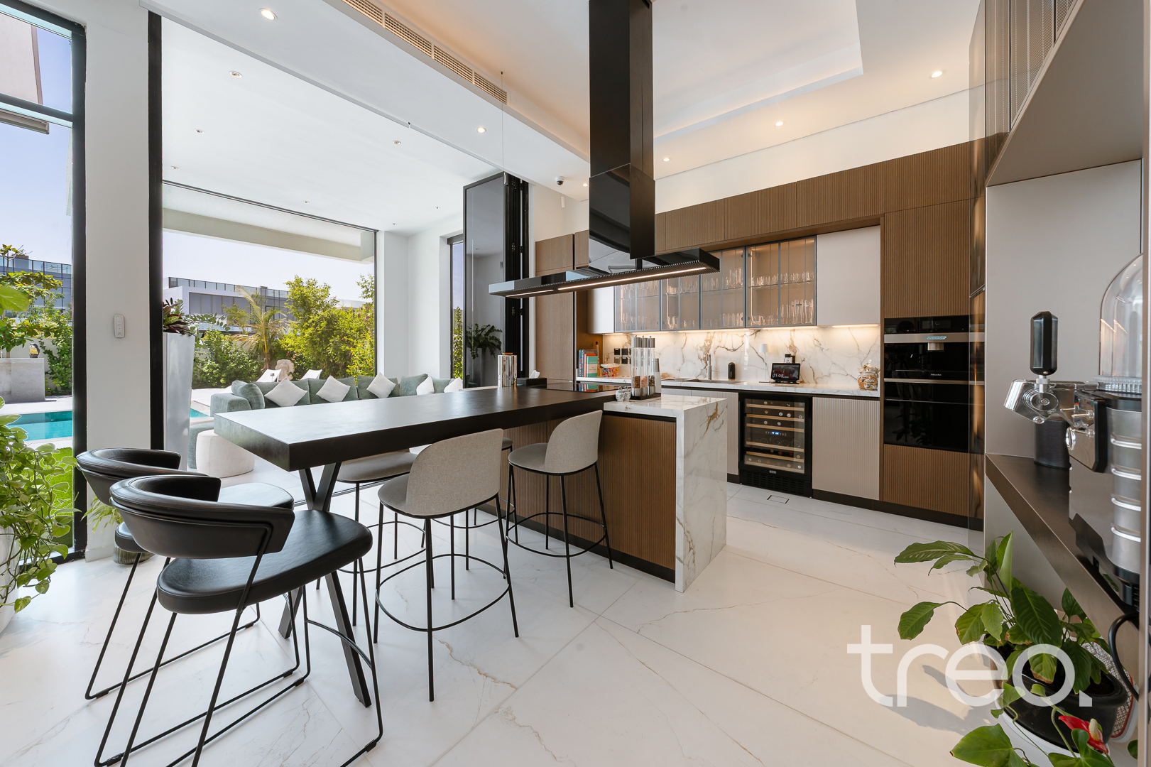As you enter this villa, you immediately see the double height ceilings leading into the living, dining area and Italian fully fitted kitchen. Additional features include a double garage that accommodates two cars, a chef's kitchen, a maid's room, a driver's room and one downstairs en-suite bedroom. Upstairs, there are 5 en-suite bedrooms with built-in wardrobes and private balconies with access from a private elevator. Situated on a spacious 8,200 sq.ft plot approximately, which backs directly onto the brand new park offering various amenities, this villa comes with a private 11m infinity pool.