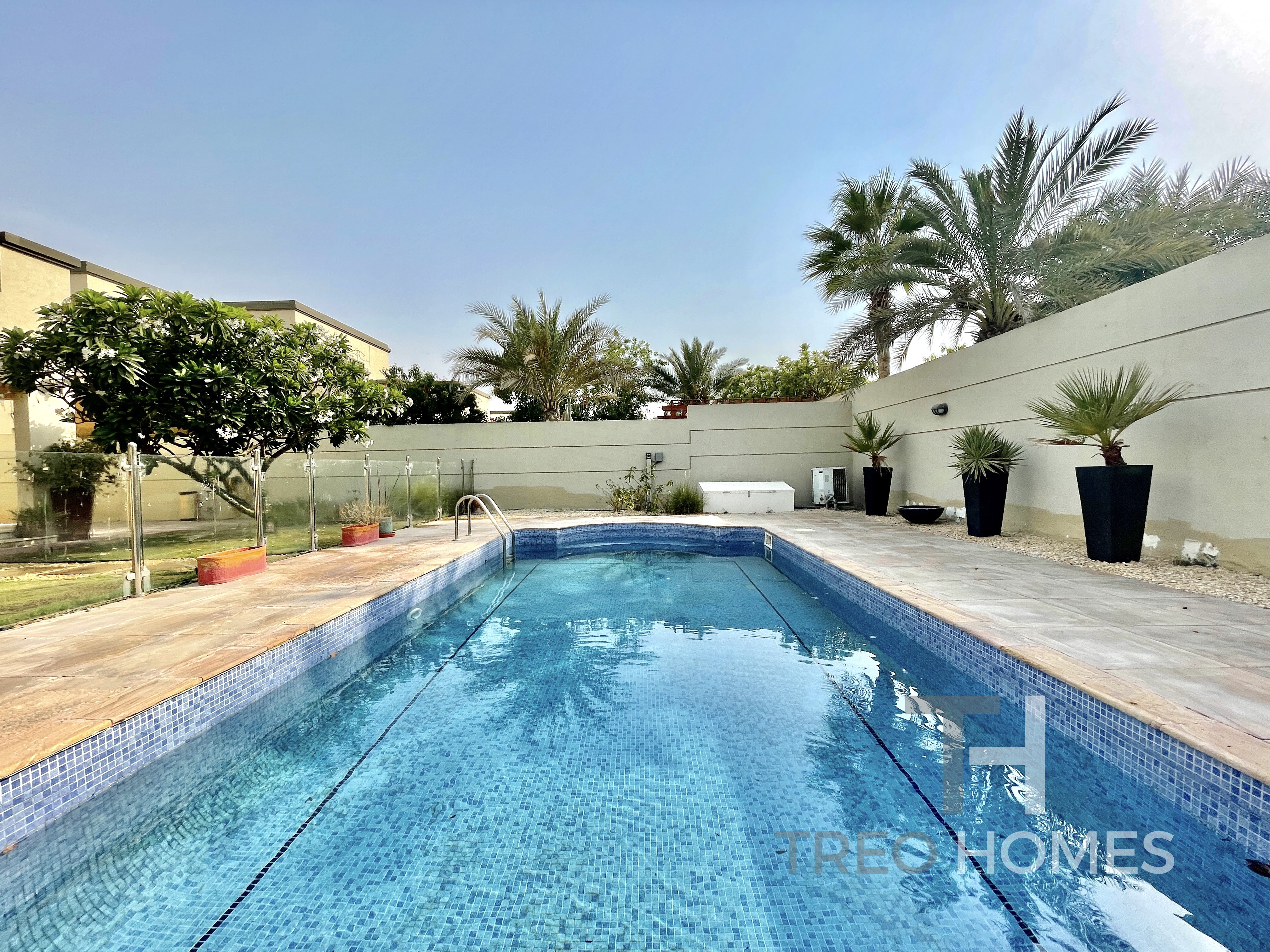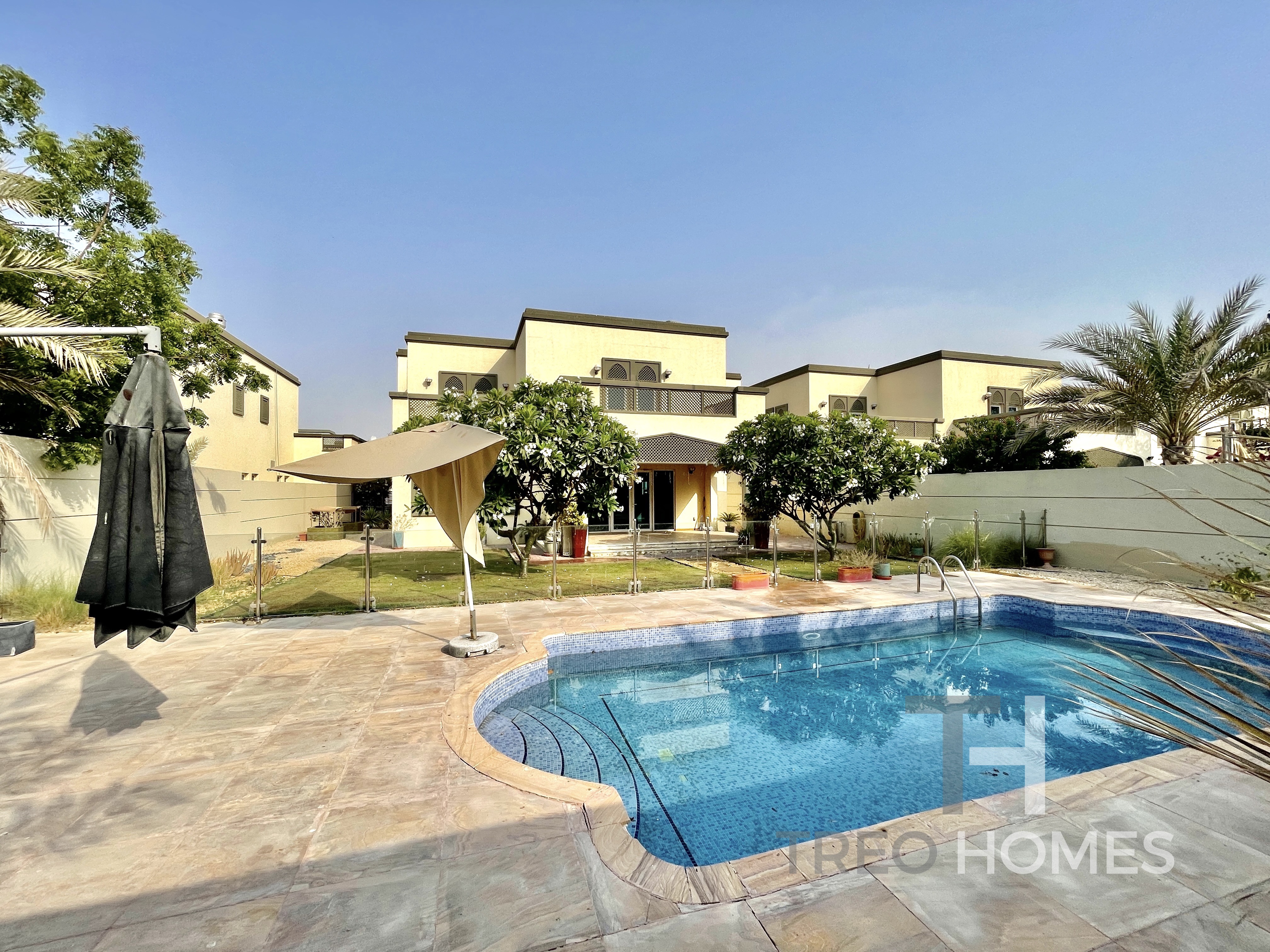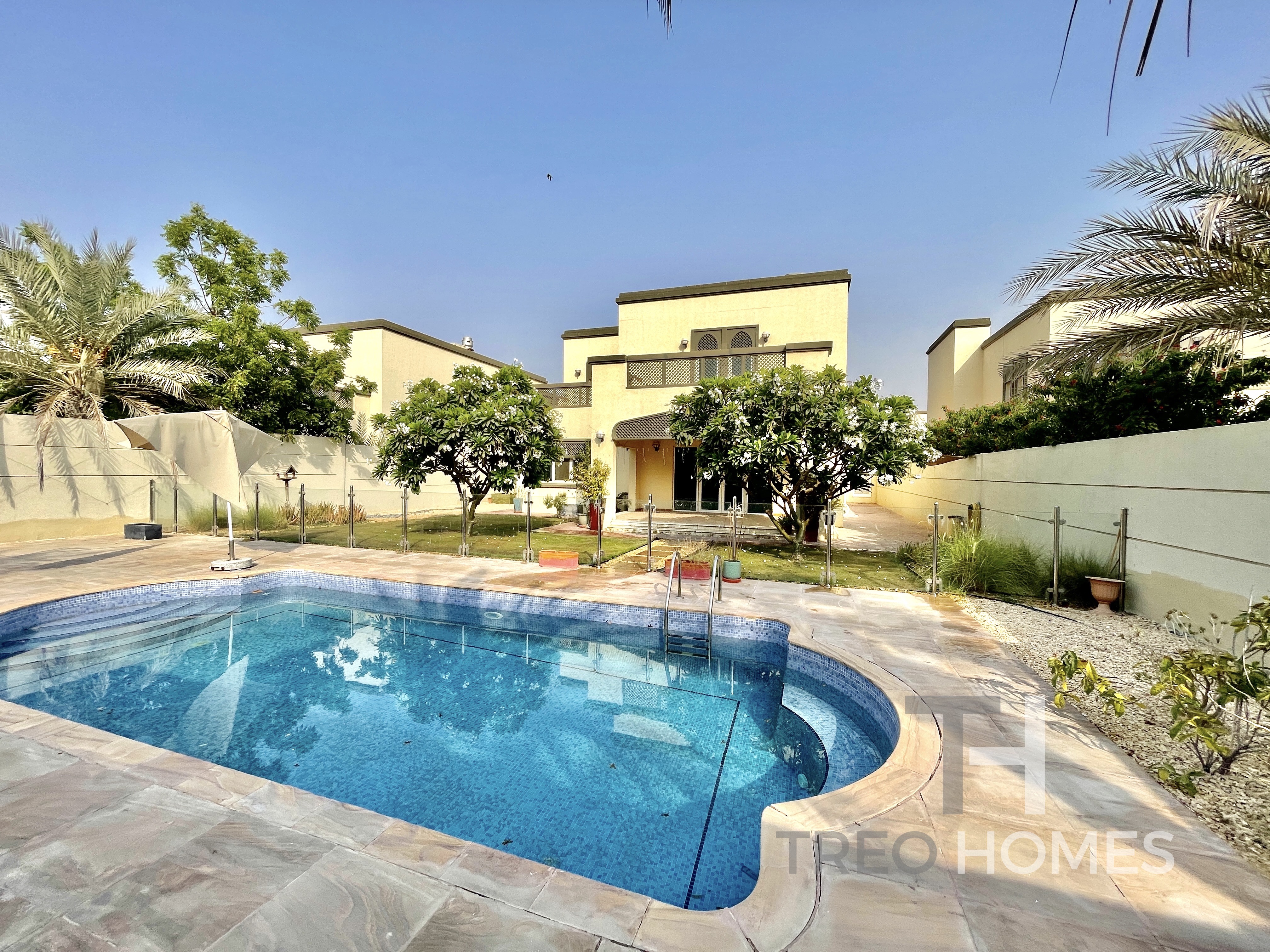 Situated on a large plot of 7,944 SQFT, this immaculate property is a must-see 4 bedroom. Downstairs, the floor plan offers a combined open-plan living, dining, and kitchen that leads onto the garden. The property additionally has a temperature-controlled swimming pool and a fully landscaped garden. Upstairs includes a second family room and 3 bedrooms, all of which have built-in wardrobes and ensuite bathrooms. The master bedroom includes a walk-in closet and a private balcony.