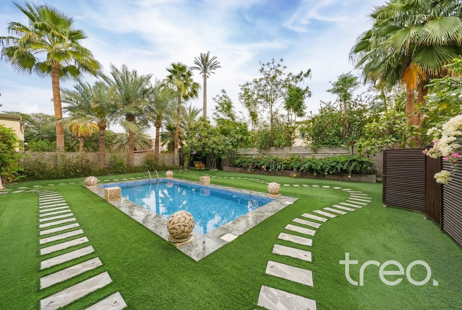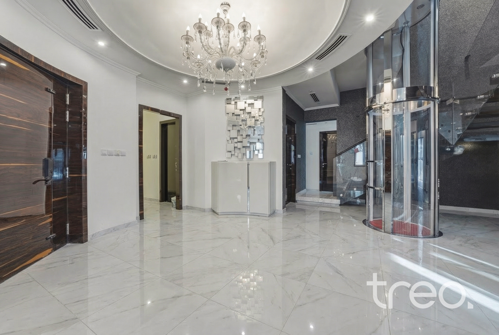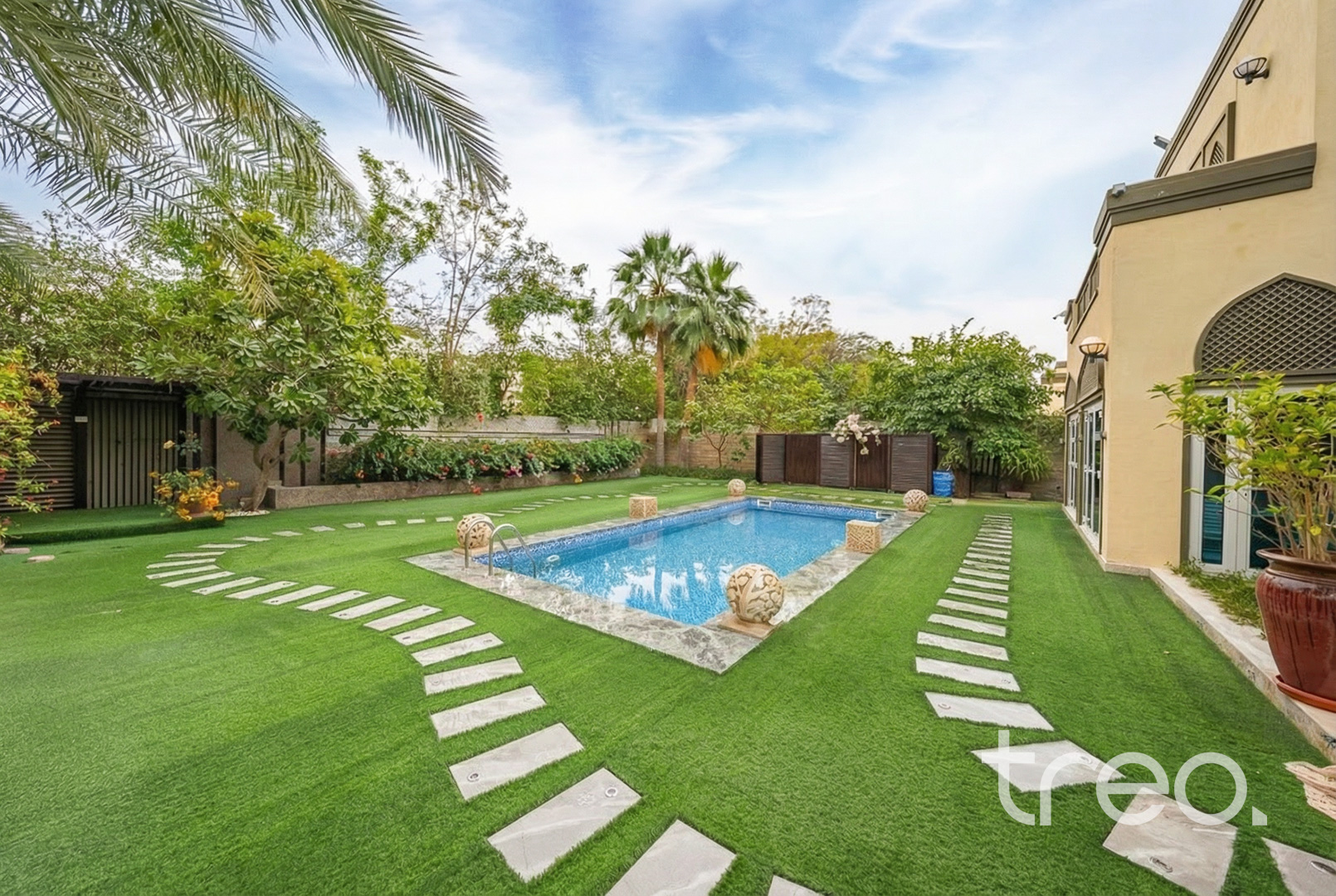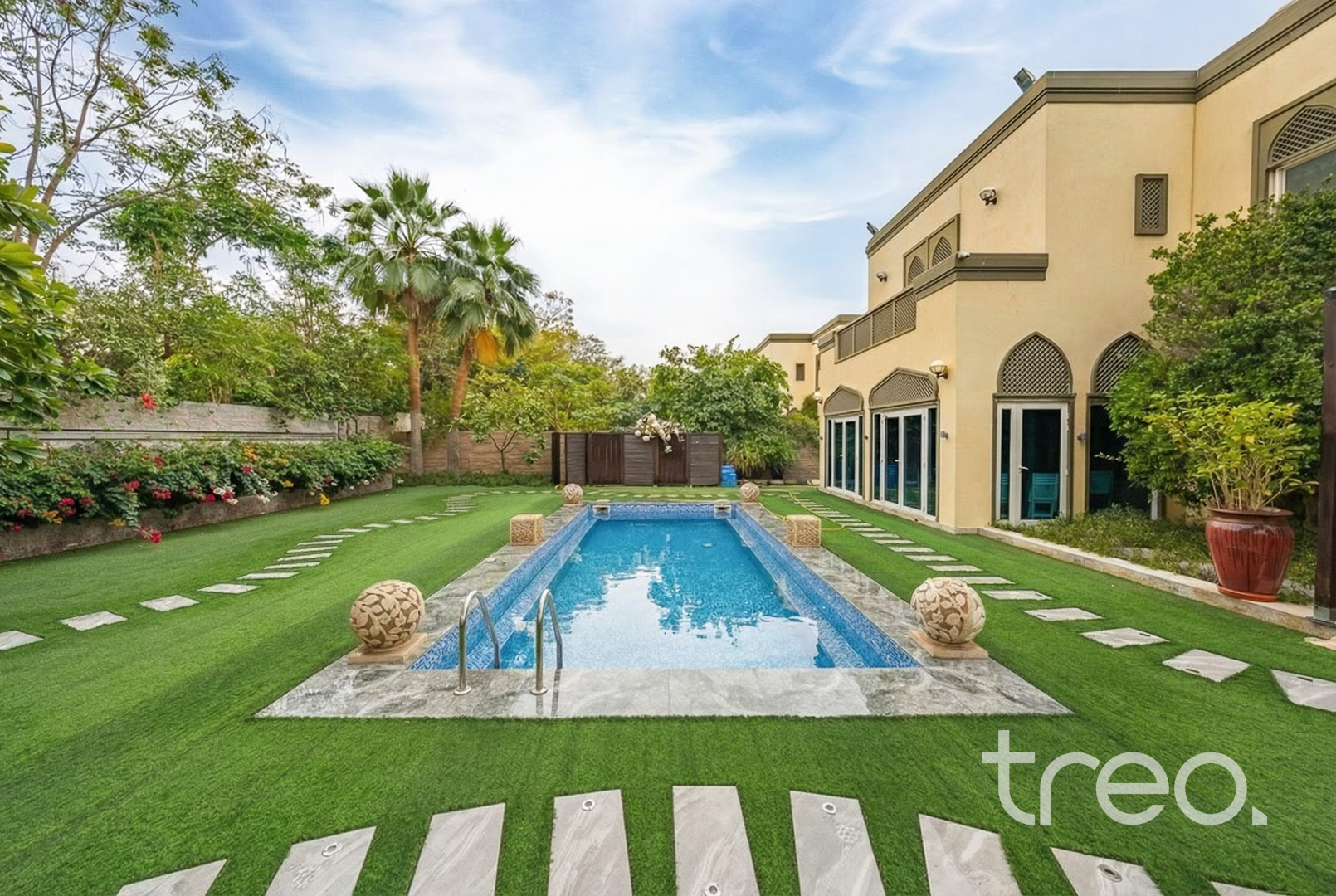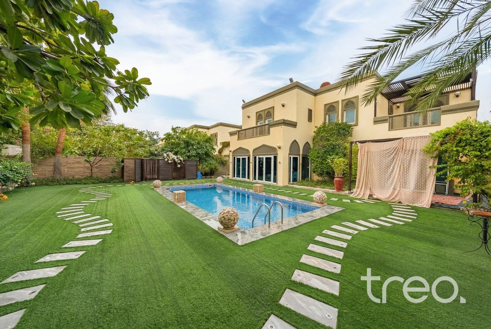 This previously owner-occupied villa has been fully extended by 432 sq. ft. with developer approval. Extensions have been completed on the ground floor to increase the living area and one of the bedrooms upstairs. This extended 5-bedroom has also been renovated with marble and wooden flooring throughout, a floating staircase and a private elevator. Additionally, features included a double garage, maid rooms and one downstairs ensuite bedroom. All bedrooms are en-suite with each room having access to a private balcony. The master bedroom comes with a walk-in closet. With a fully landscaped garden, the villa has its own private swimming pool, BBQ area and pergola. Finance available with Treo Mortgaging Partners.