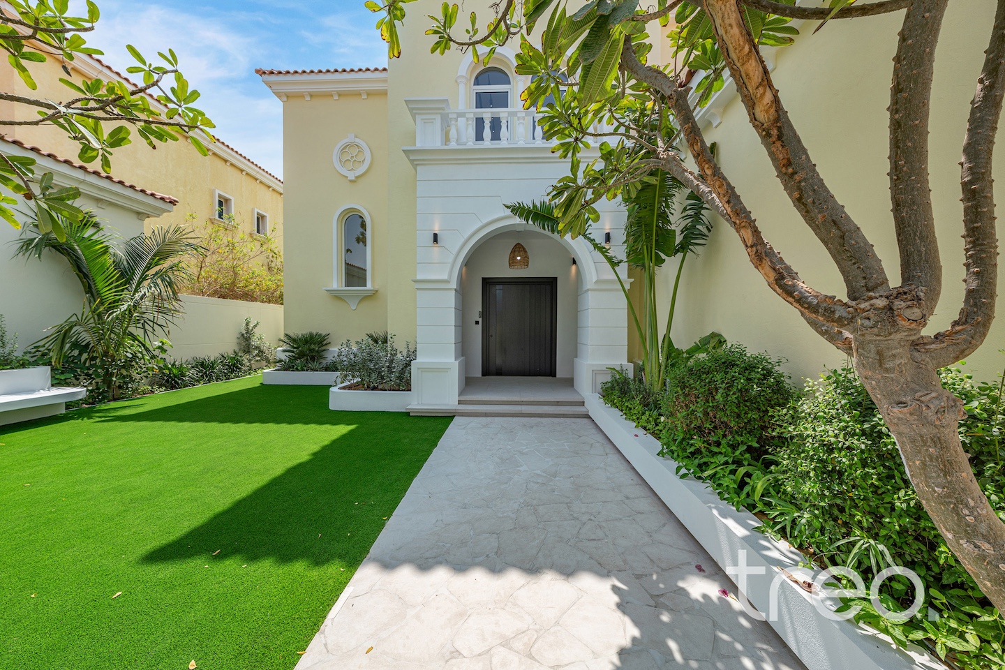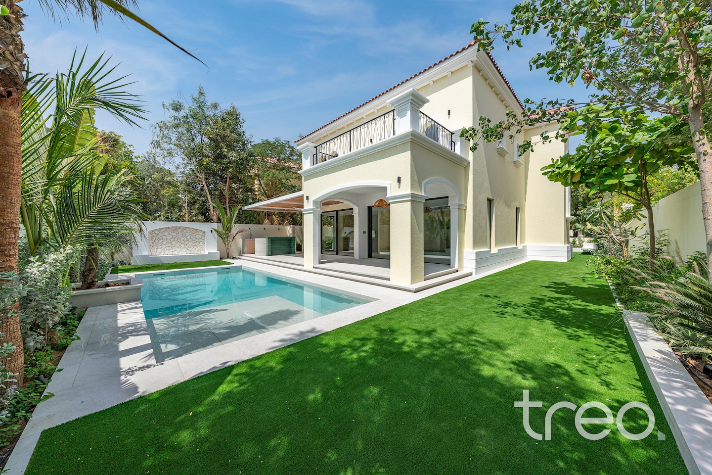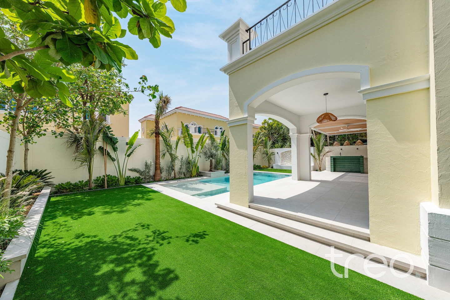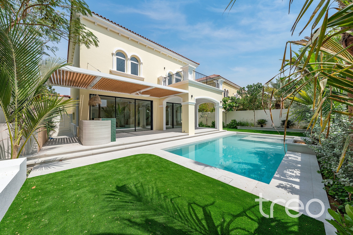If you are looking for one of the best renovated 4-bedrooms in Jumeirah Park, come see this home. The villa layout has been fully remodelled to a larger open plan living and dining space with a fully integrated Siemens island kitchen. Additionally, this villa has floor-to-ceiling windows, extended ceilings, TV media wall, a built-in bar, a maid's room, Porcelanosa tiles and Bagno appliances throughout. Upstairs has 4 bedrooms with bespoke built-in wardrobes, and the master bedroom has its own private balcony and walk-in closet. The garden has been fully landscaped with an additional terrace, a BBQ area, a private swimming pool, and an additional rock-wall seating area.
