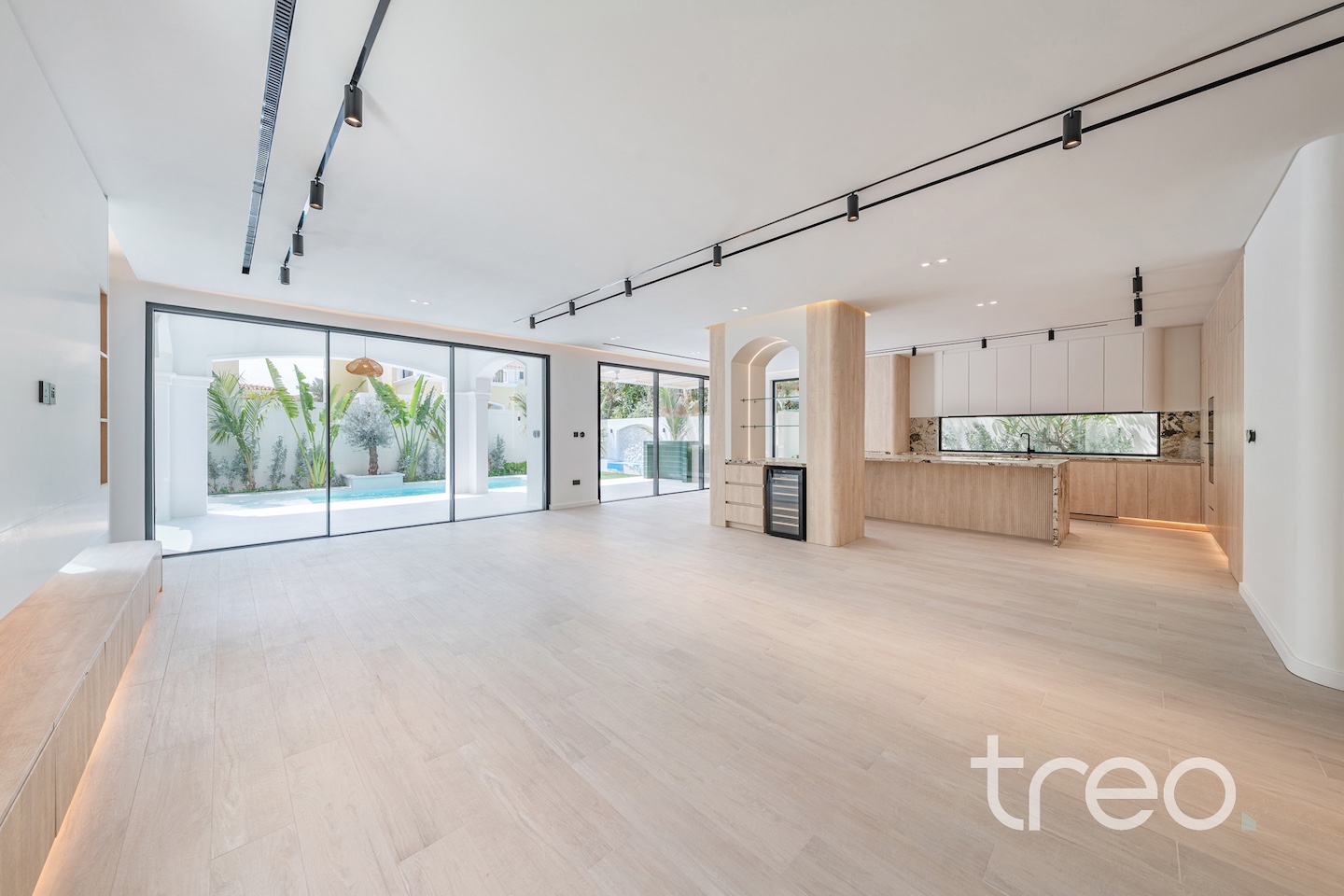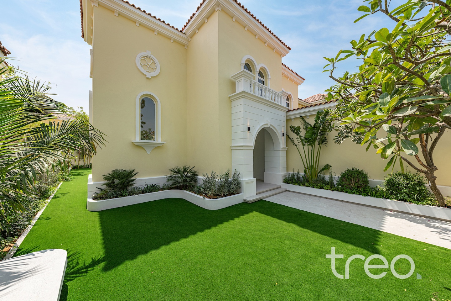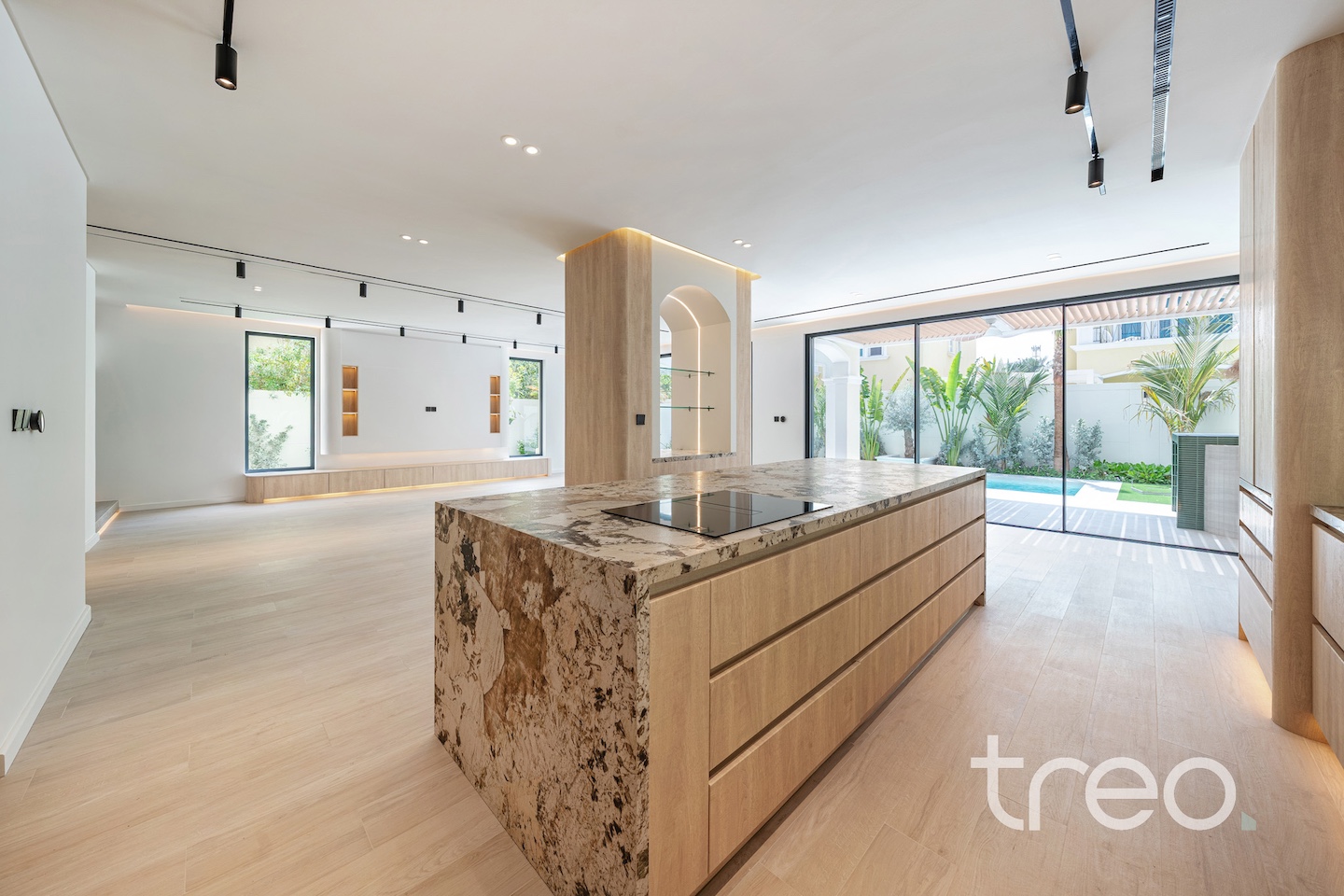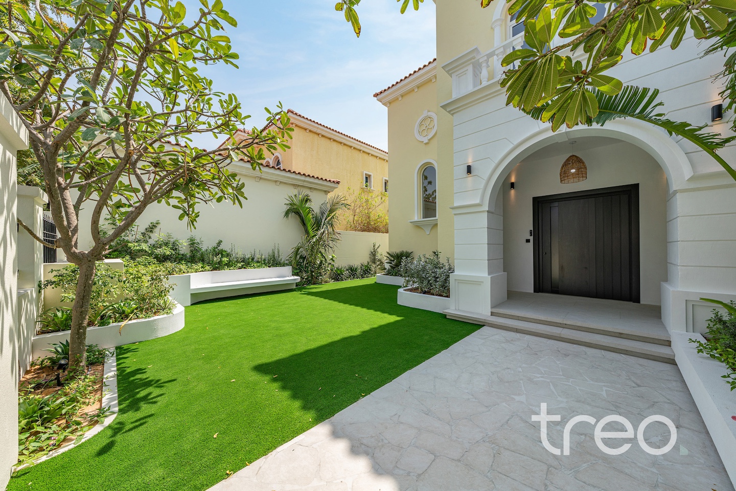 If you are looking for one of the best renovated 4-bedrooms in Jumeirah Park, come see this home. The villa layout has been fully remodelled to a larger open plan living and dining space with a fully integrated Siemens island kitchen. Additionally, this villa has floor-to-ceiling windows, extended ceilings, TV media wall, a built-in bar, a maid's room, Porcelanosa tiles and Bagno appliances throughout. Upstairs has 4 bedrooms with bespoke built-in wardrobes, and the master bedroom has its own private balcony and walk-in closet. The garden has been fully landscaped with an additional terrace, a BBQ area, a private swimming pool, and an additional rock-wall seating area.