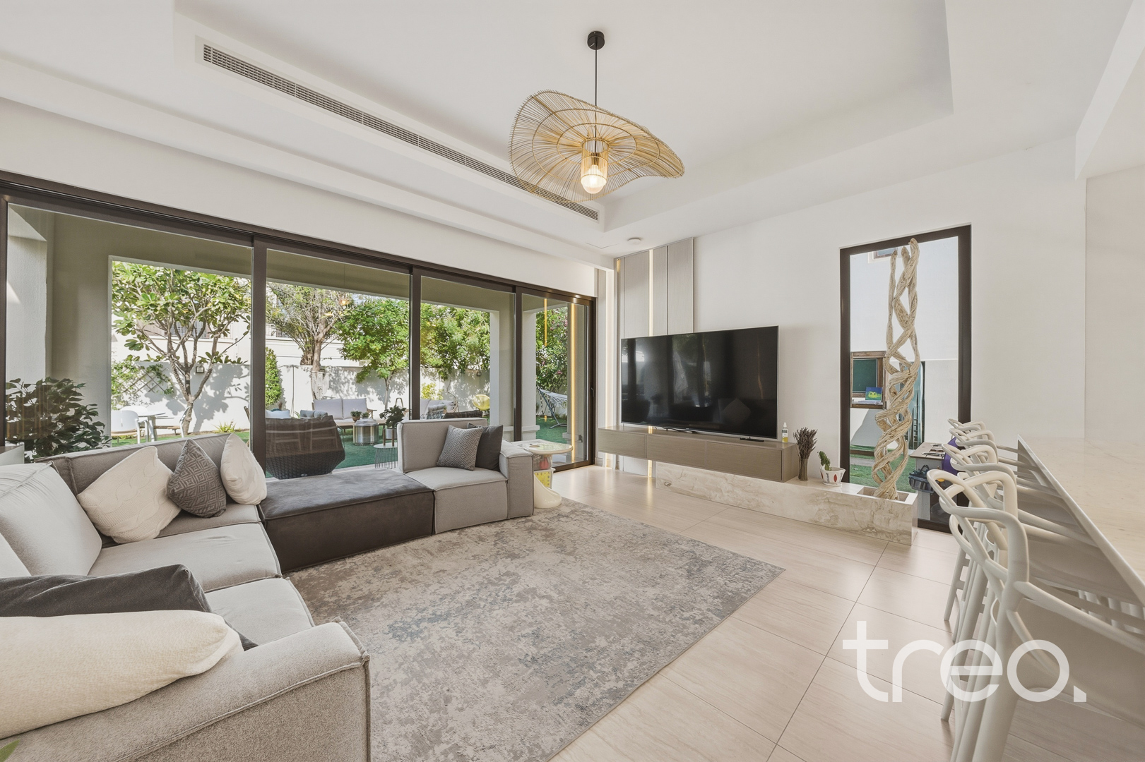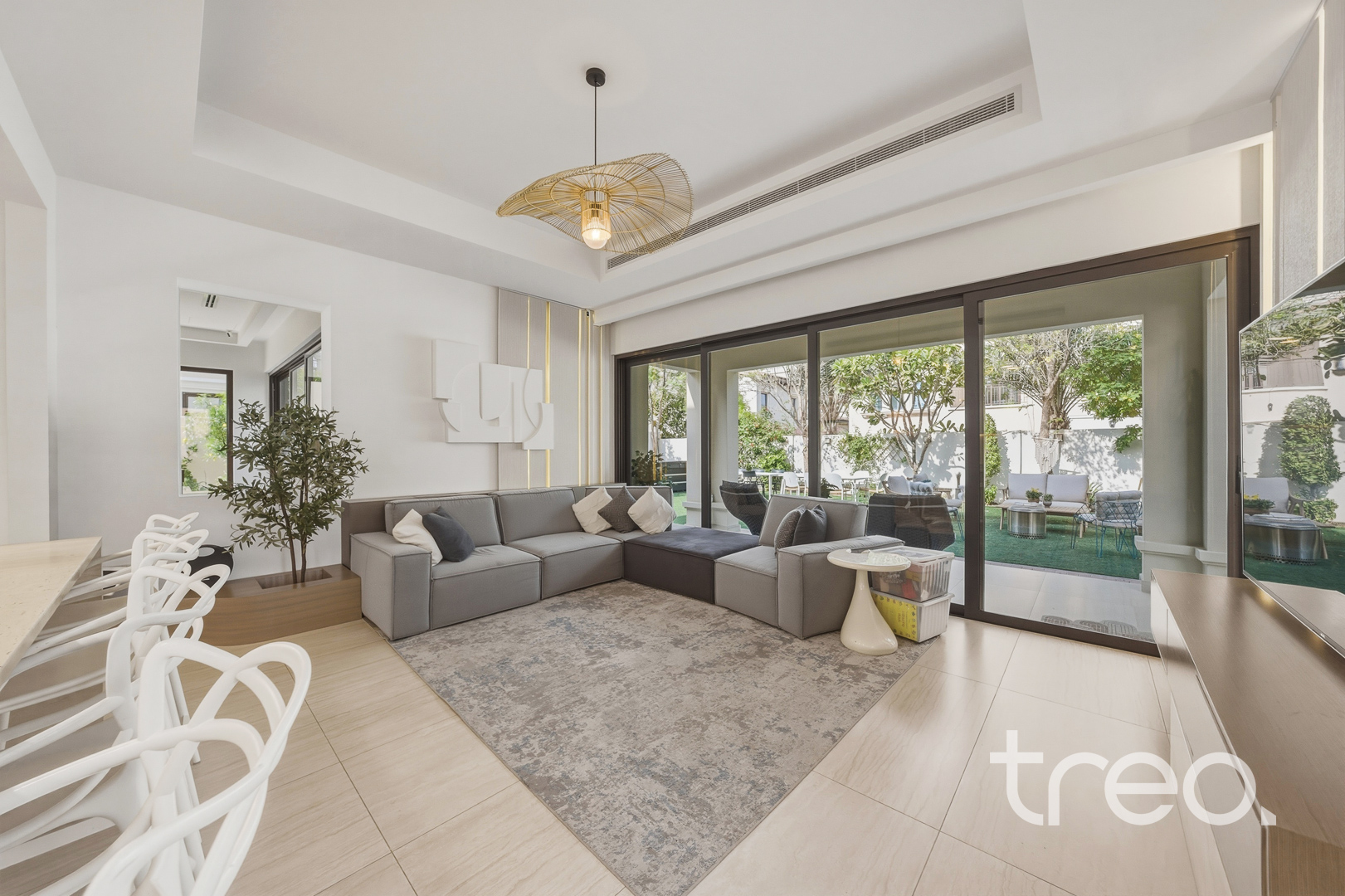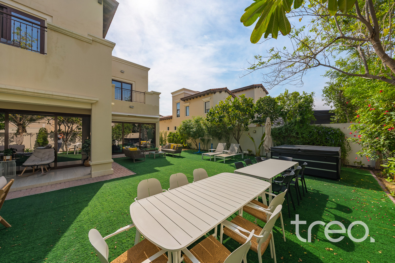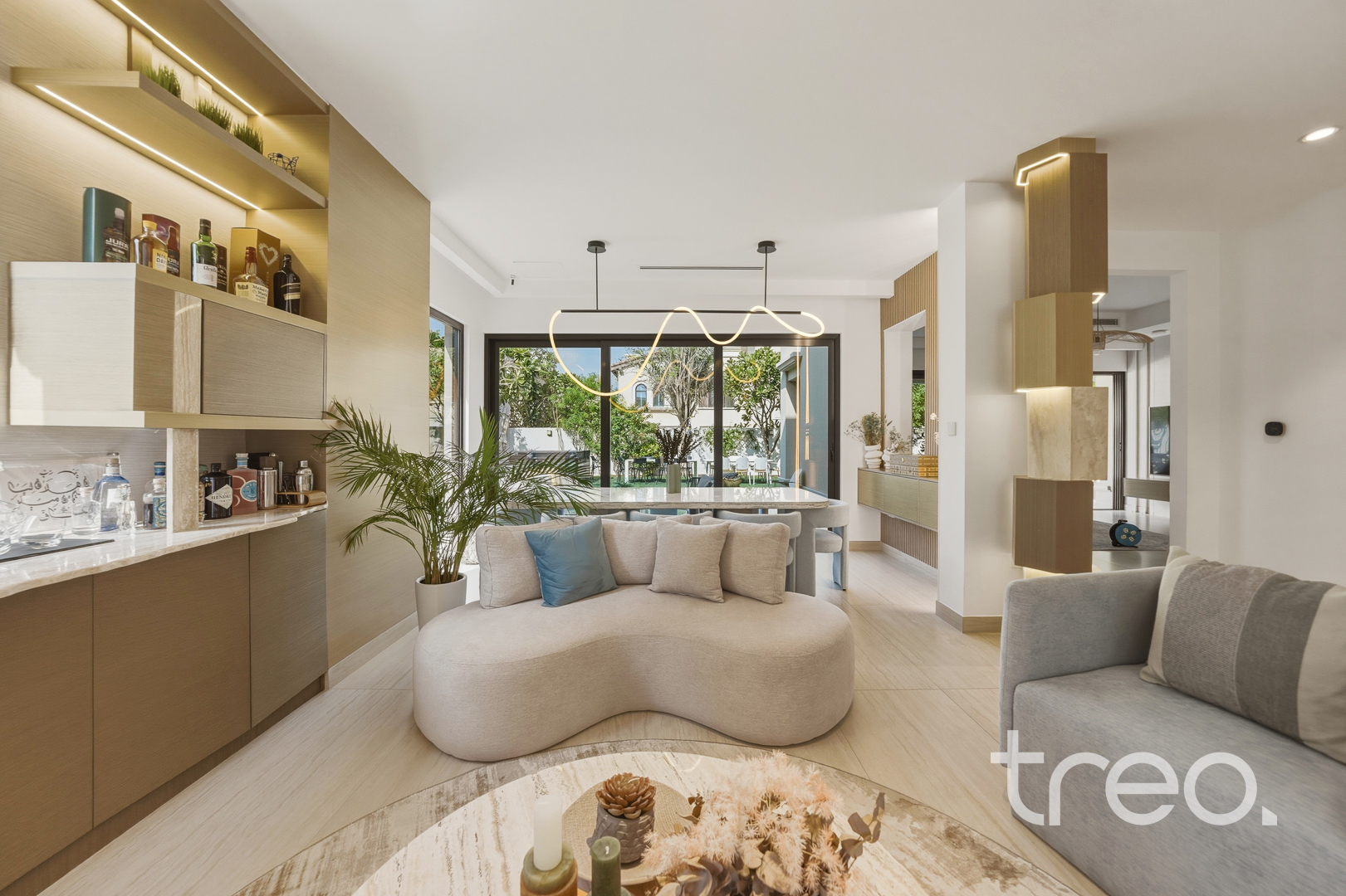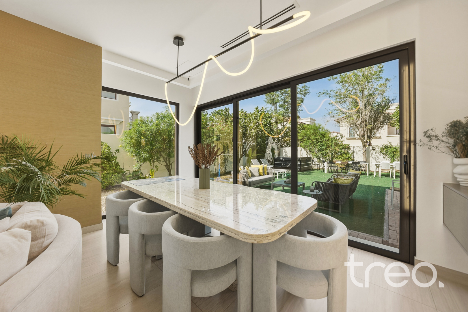 The property features a spacious open-plan layout, centred around a contemporary entertainment kitchen, ideal for both everyday living and hosting guests. Every detail has been carefully considered, with custom-designed furniture tailored specifically for the home, alongside high end finishes and fittings throughout. The villa is fully equipped with smart home integration, offering convenience and seamless control. Positioned in a quiet internal location, the home benefits from a bright and airy setting, enhancing the sense of space and natural light. Sitting on a generous 6,888 sq.ft plot, the outdoor area provides ample room for entertaining, making it perfect for social gatherings or relaxed family living.