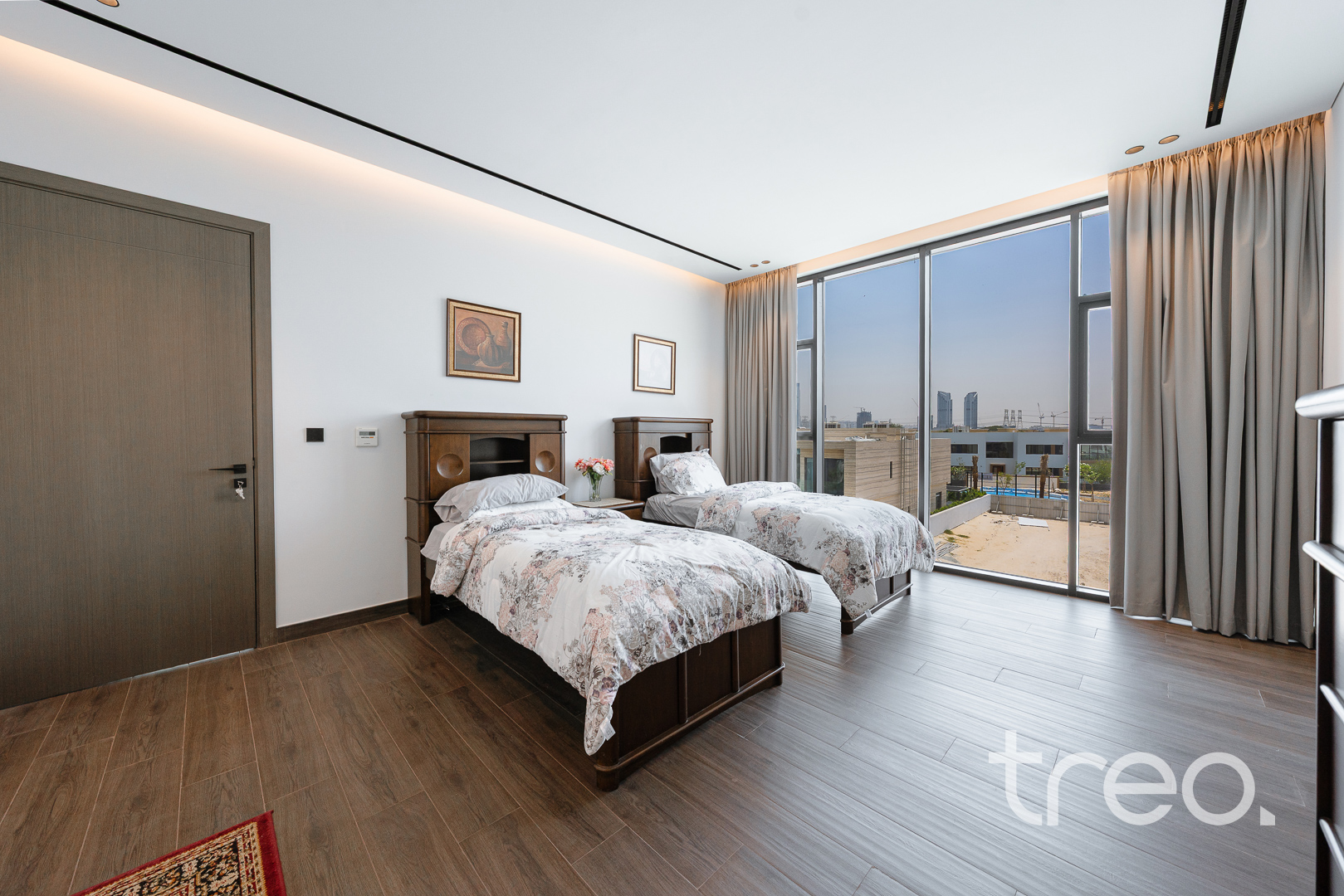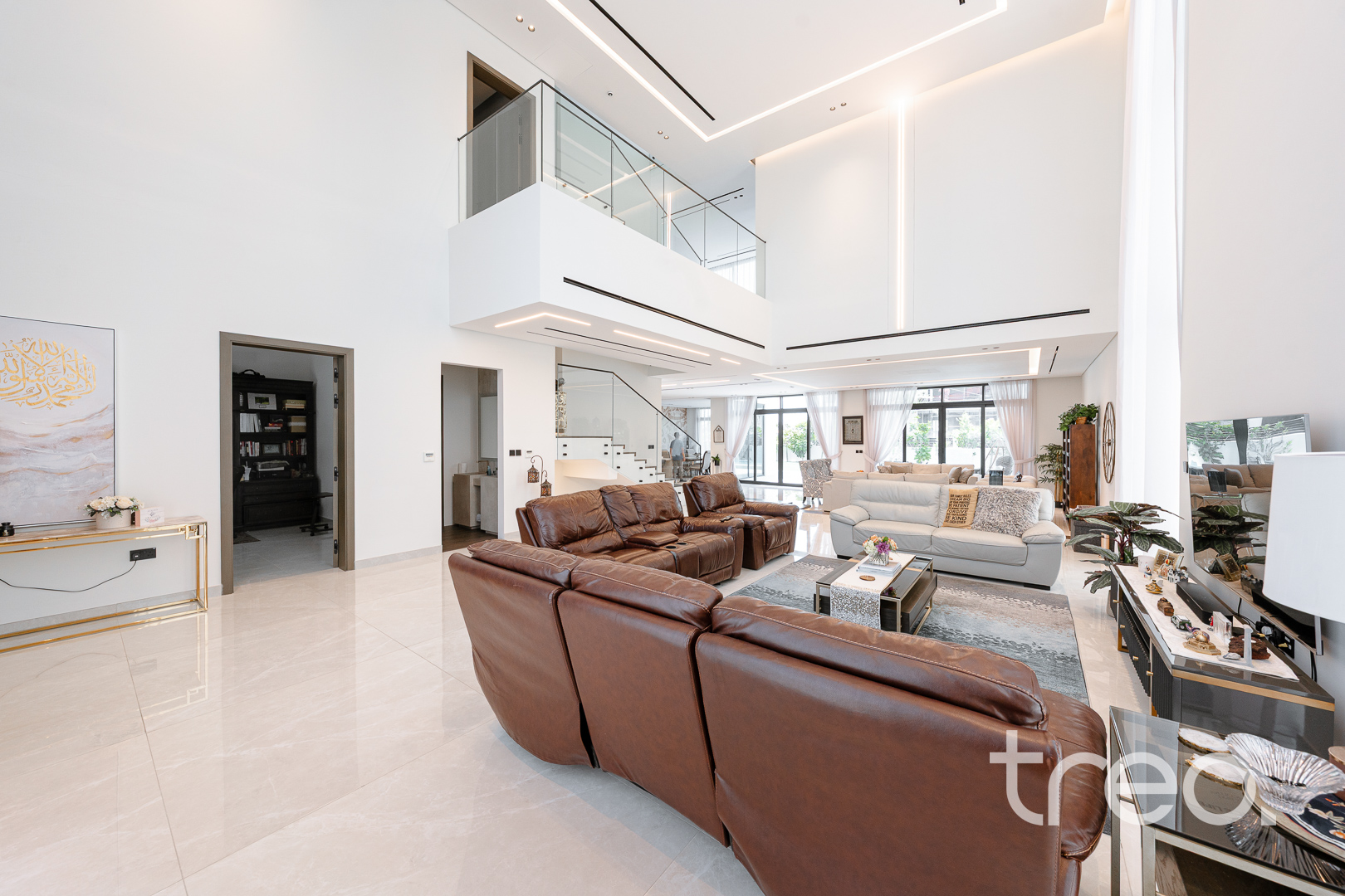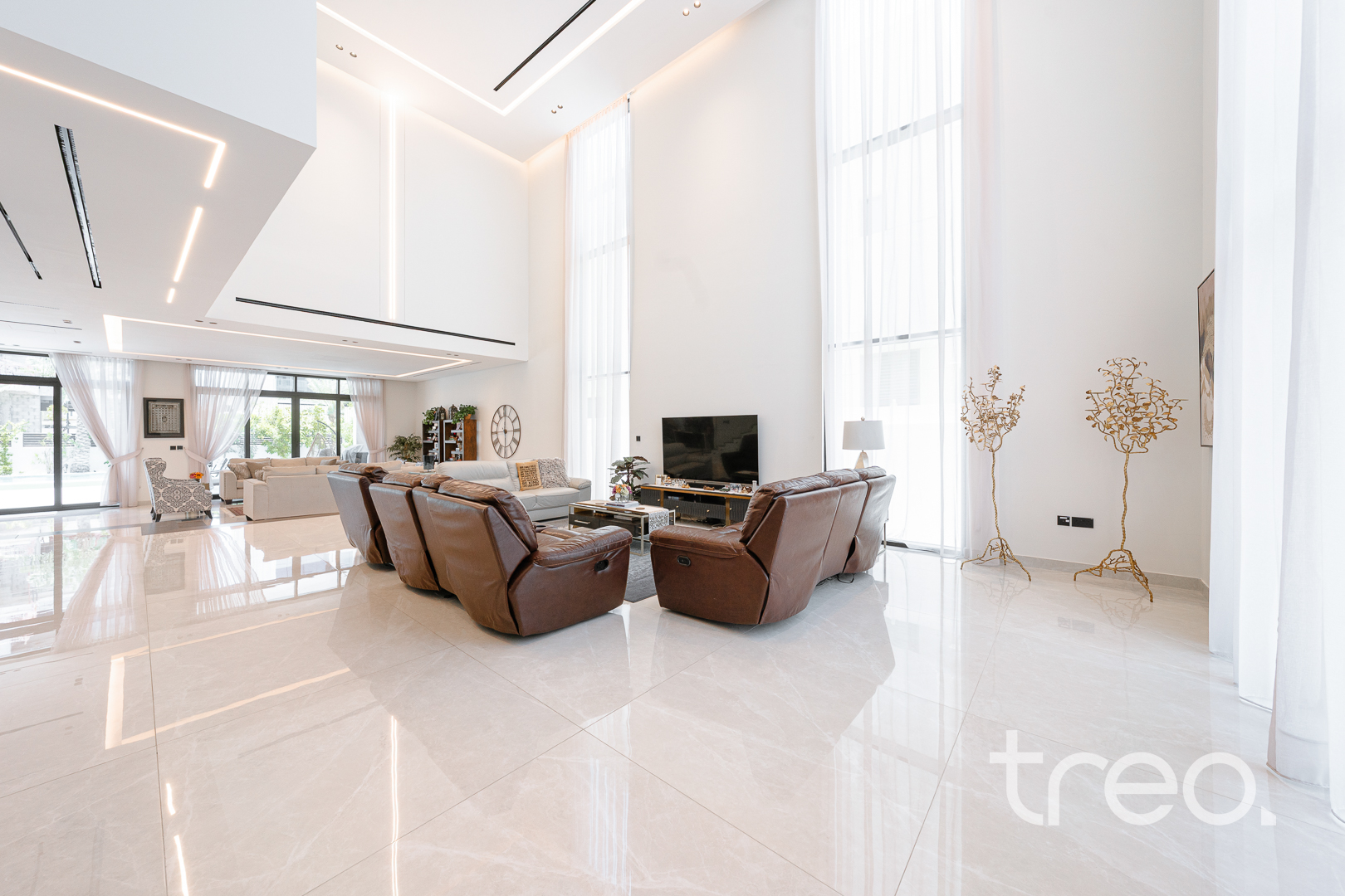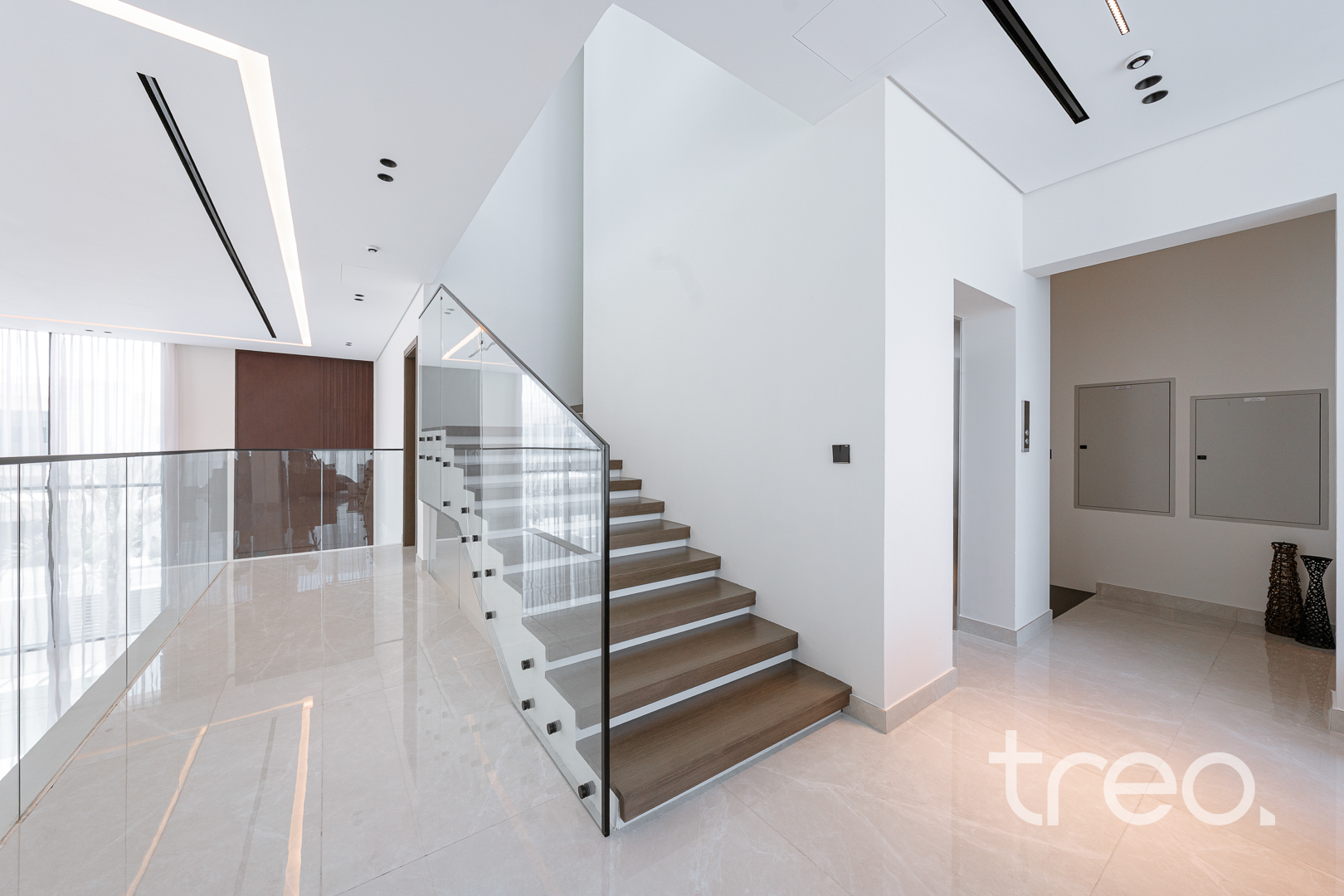 This modern 7 bedroom triplex is new to the market property which comes with 7 fully fitted bedroom with en-suites, chef and show kitchens, maids and driver rooms, elevator, infinity pool and an open plan expansive living and dining area. With 5m double height ceilings in the living room and floor to ceiling windows allows ample natural light to enter the living room and dining. All Bedrooms are spread across the 3 floors with one bedroom on the ground floor, 6 bedrooms between the first and second floor which all connect to the inbuilt elevator allowing for easy of access.