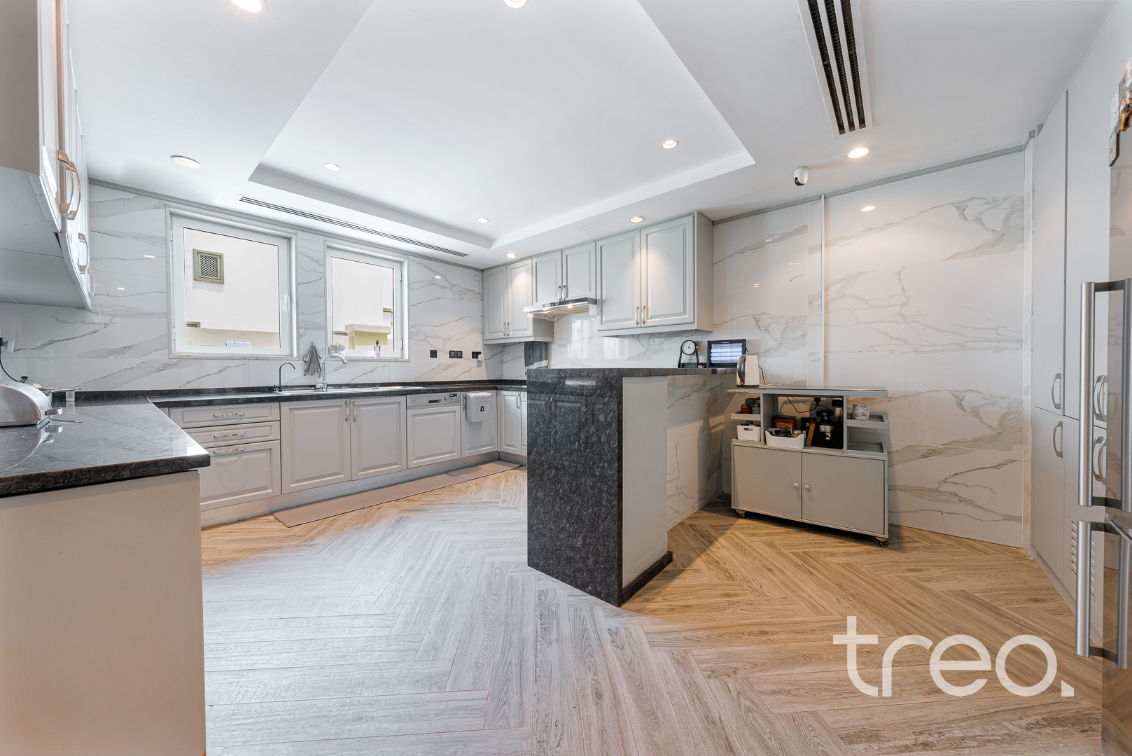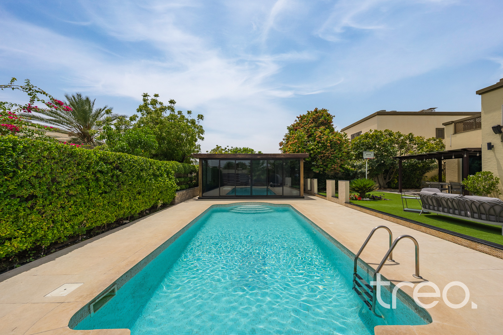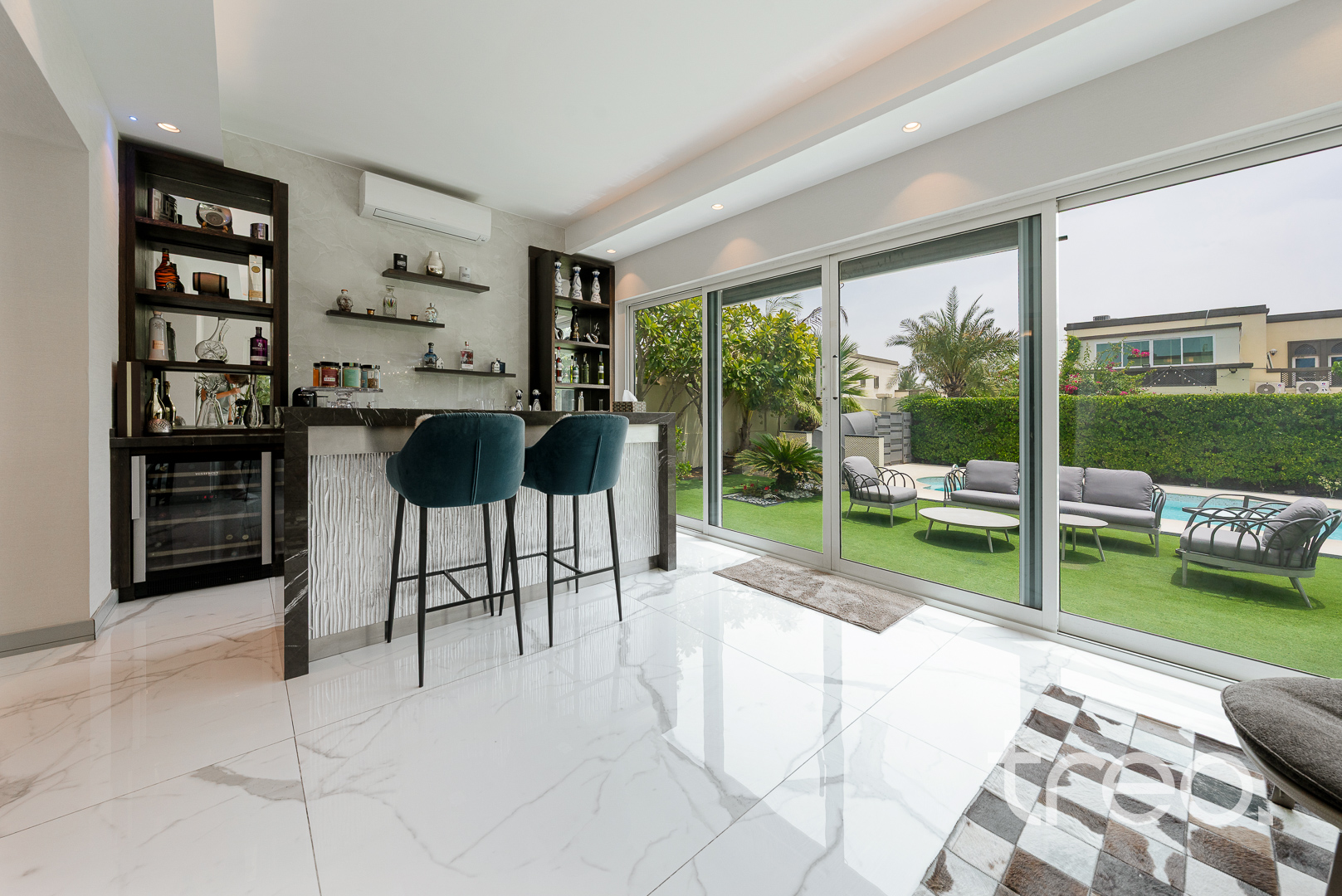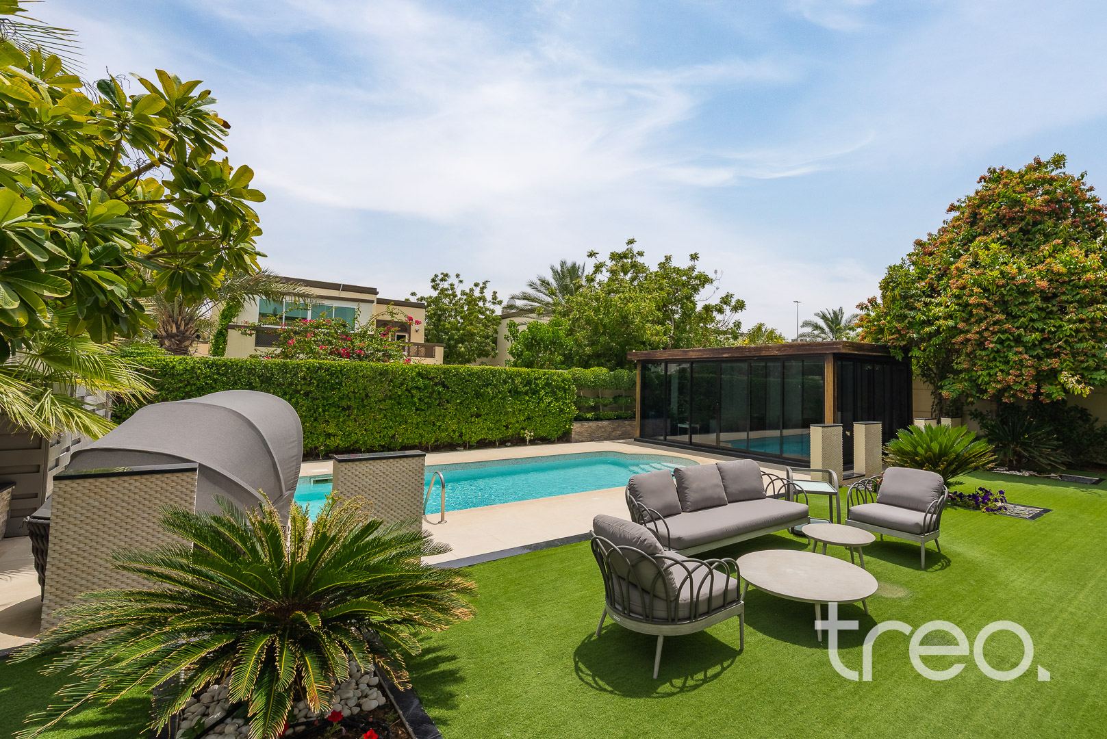 The villa layout has been extended to enlarge the open plan living, dining which connects to the fully integrated kitchen. Additionally, this villa has extended ceilings throughout, french sliding doors, a TV media wall, a double garage and maid rooms. Upstairs has 3 en-suite bedrooms with bespoke built-in wardrobes, with the master bedroom having a remodelled layout to allow for dual walk-in closet systems. The garden has been fully landscaped with an additional pergola, a private swimming pool and a BBQ area. Finance is available on this property through Treo Mortgaging Partners.